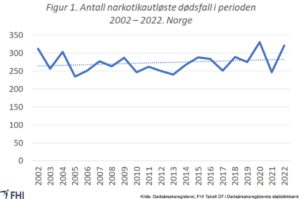 Tallene for Norge har endret seg lite siden 1990-tallet, men grafen fra Folkehelseinstituttet viser en nominelt svakt oppadgående trendlinje. Folketallet i Norge har økt med rundt én million fra 2002 til 2022, så de siste tallene skal fordeles på en større folkemengde, men fremdeles har Norge minst ti ganger så høy narkotikadødelighet som Portugal i forhold til hvor mange vi er.