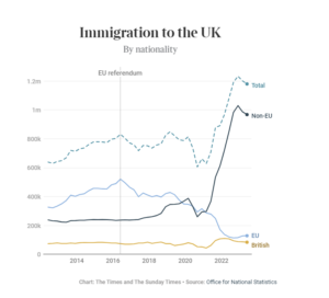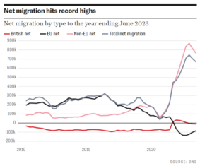 Før Brexit lå netto immigrasjon nokså stabilt på 200-300.000 årlig. Regjeringen lovte i 2019 å redusere tallet som den gangen lå på 226.000. I stedet opplever britene over en tredobling på tre år, etter en pause under pandemien. Det er med andre ord en nokså signifikant økning på kun tre år.