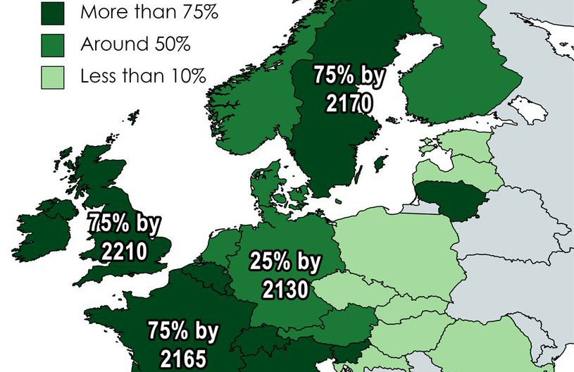 Befolkningsfremskrivninger antyder at muslimer rundt 2160–2170, altså om fire-fem generasjoner, vil utgjøre tre av fire borgere i land som Frankrike, Sverige og Spania mens land som Storbritannia, Belgia, Italia, Sveits, Hellas, Irland og Litauen vil være der en generasjon senere. Norge henger litt efter og vil bare ha rundt 50 prosent muslimer i 2200.