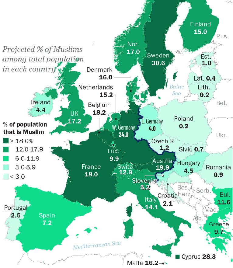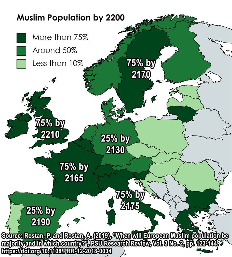Ifølge fremskrivninger fra PSU Research Review fra 2019 vil Vest-Europa i stor grad være muslimsk innen 2200. I Frankrike, Storbritannia, Belgia, Italia, Sverige, Sveits, Hellas, Irland og Litauen vil mer enn tre fjerdedeler av befolkningen være muslimer. I Norge, Nederland og Tyskland vil andelen være noe lavere, men dog rundt 50 prosent. Idag ligger andelen på rundt ti prosent.