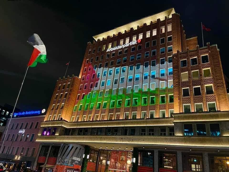 Arbeiderpartiet lyser opp sin bygning med palestinaflagg. Tror virkelig politikere i byer som Oslo, Trondhjem, Bergen, Tromsø at folk vil oppfatte deres flagging for «Palestina» som noe annet enn en støtteerklæring til Hamas sin massakre?
