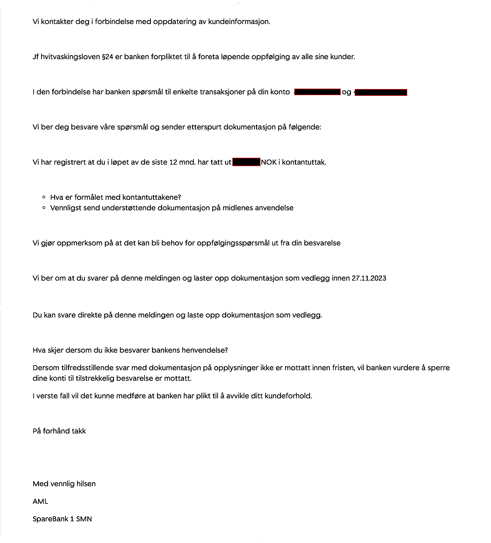 Under trusler om stengning av kontoen forlangte banken at jeg måtte redegjøre for kontantene jeg bruker. Men banken ble ikke glad da jeg gjorde akkurat dét med alle kvitteringene fra det siste halvannet årets innkjøp. Dessverre var det ikke nok til å avslutte prosessen heller. Skal tro om jeg blir renvasket for mistanker om hvitvasking?