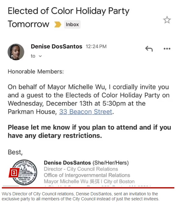 Den progressive demokrat-ordføreren i Boston, Michelle Wu, fikk forbausende få kritiske spørsmål etter at hun avholdt et segregert julebord på rådhuset. De syv hvite representantene fikk sine invitasjoner trukket tilbake etter først å fått epost om julebord. De hvite var ikke ønsket.