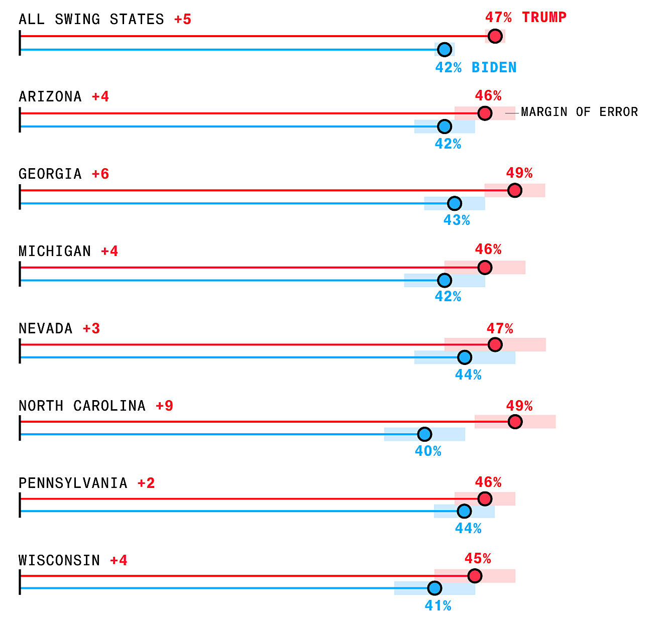 Donald Trump har totalt fem prosent­poengs forsprang på Joe Biden i sju amerikanske vippe­stater, der Trump har ledelsen i samtlige, viser en ny menings­måling.