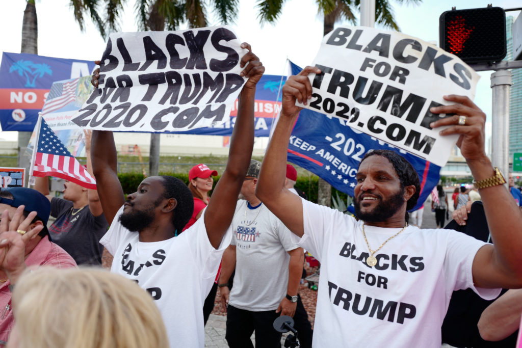 Miami, Florida/USA-June 26, 2019: African American activists for www.BlacksForTrump2020.com and other protesters outside the Democratic presidential debate. Photo: Shutterstock by Hernando Sorzano, United States.