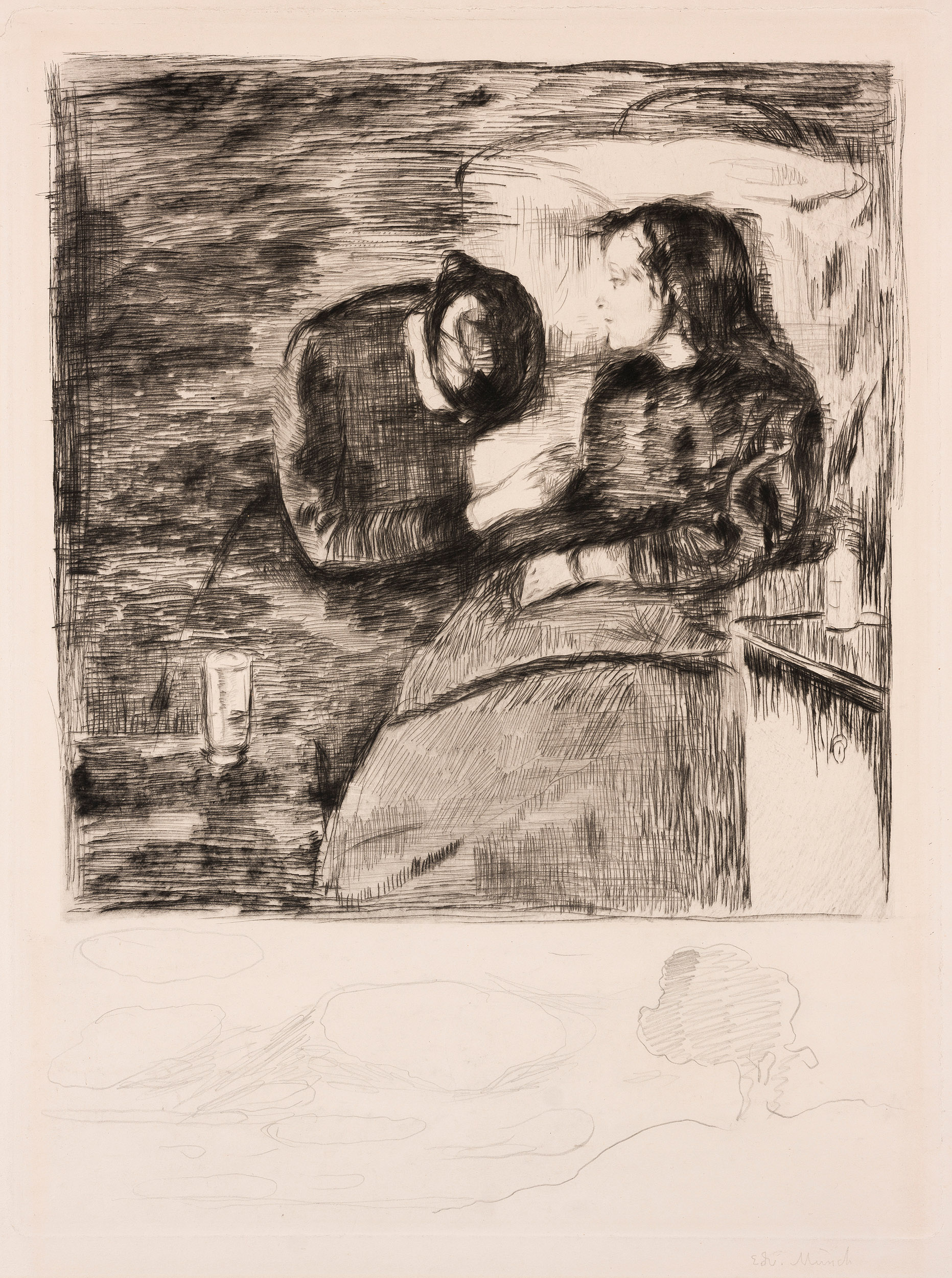 Edvard Munch (1863-1944). Koldnålsradering og blyant, 51 x 34 cm (arket), privateie. Dette trykket ble solgt for NOK halvannen millioner (som var utropsprisen) hos Grev Wedels Plass Auksjoner i Oslo den 16. desember i år. Under selve trykket er det påført en skisse med blyant. Vi finner et mer bearbeidet eksemplar i Nasjonalmuséet i Oslo, […]