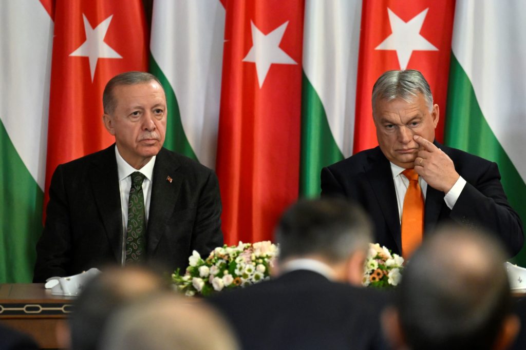 Tyrkias president Recep Tayyip Erdogan og Ungarns statsminister Viktor Orban på et møte i Budapest 18. desember 2023. Foto: AP Photo/Denes Erdos)