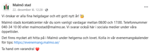 På sin offisielle side vil ikke Malmö by si «god jul» til folk. Tidligere i år da muslimer feiret id inviterte Malmö by derimot offisielt til islamsk feiring «for alle».