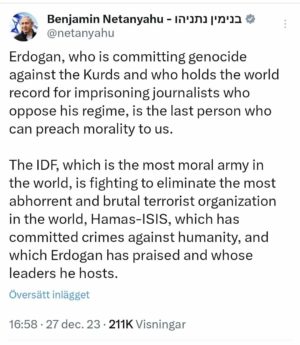 Netanyahu svarte på Erdoğans uttalelse gjennom et innlegg på X: