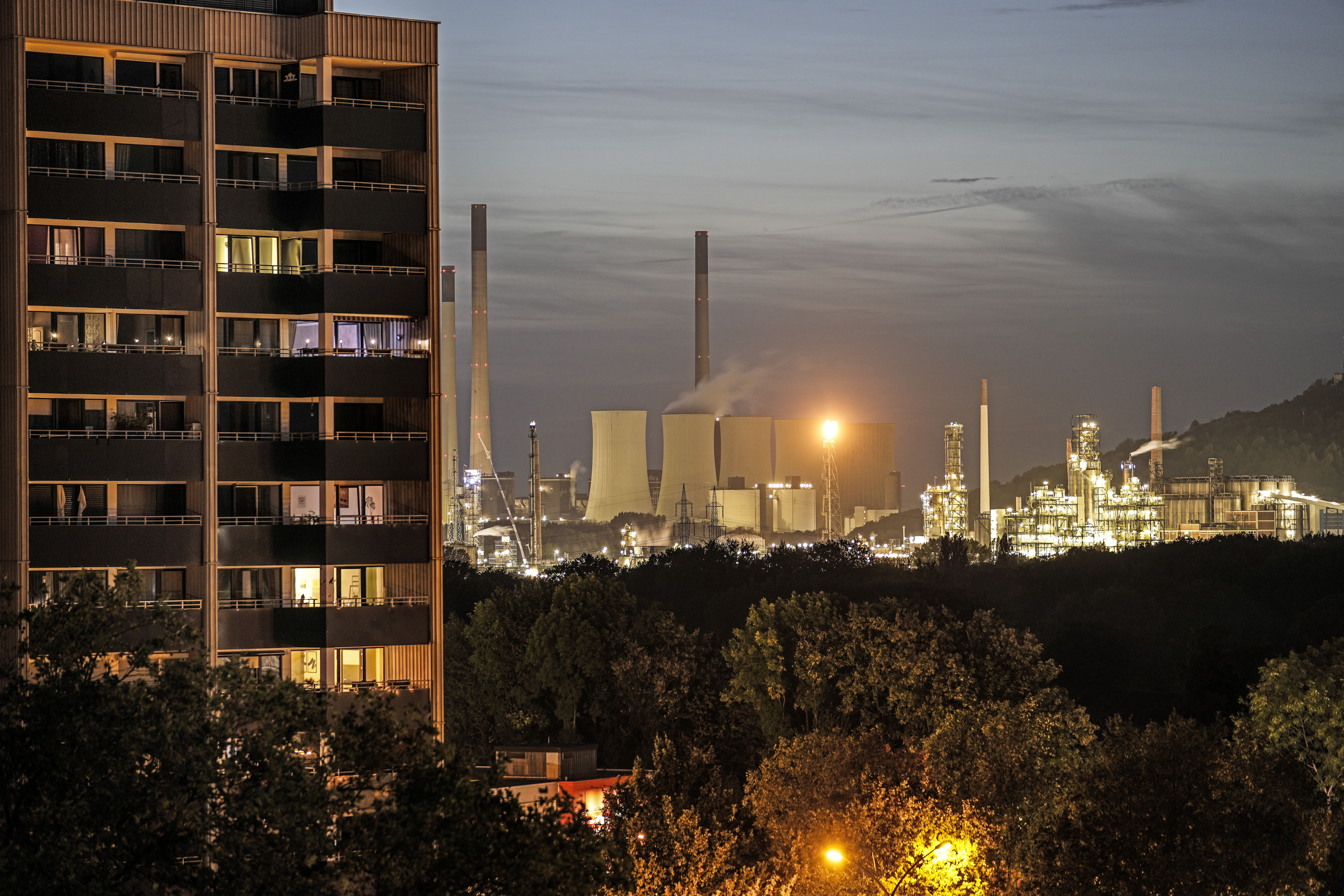 Utsikt til kullkraftverket Uniper Scholven og et raffineri tilhørende BP fra et boligområde i Gelsenkirchen den 2. oktober 2023. Foto: Martin Meissner / AP / NTB.