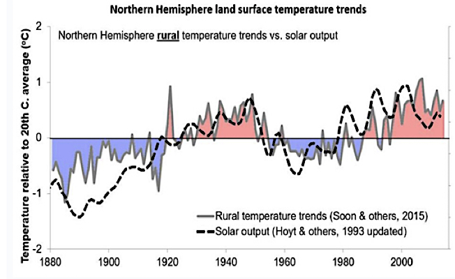Figuren nedenfor viser god sammenheng mellom endringer i solinnstråling ved toppen av atmosfæren (TOA) og global temperatur målt i landområder (utenfor byer), stikk i strid med IPCC sin påstand om at solen har ubetydelig påvirkning.