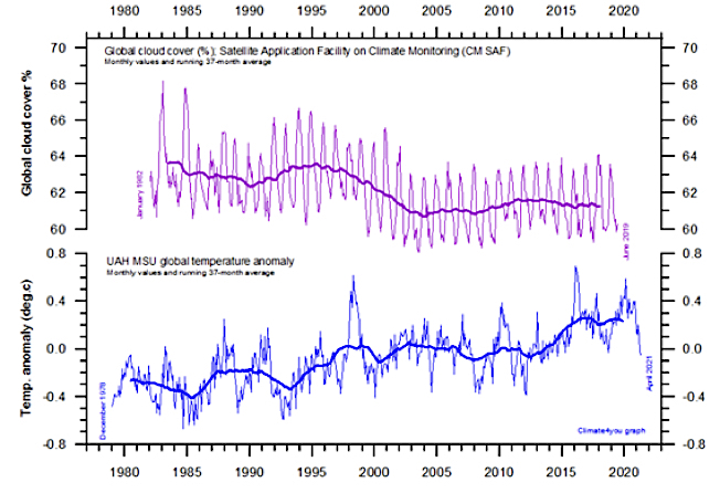 Figuren over fra prof. Humlum www.climate4you.com viser klart at når globalt skydekke har gått ned etter 1980 (øverst) så har global temperatur økt (nederst), motsatt av hva IPCC mener.