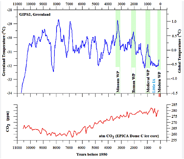 FNs klimapanel (IPCC) mener det ikke har vært varmere enn nå på 100 000 år. De har ignorert varmeperiodene som hundrevis av rapporter fra hele verden har dokumentert, som f.eks. vikingetiden (Medieval WP i figuren under), den romerske varmeperioden (Roman WP) m.fl.