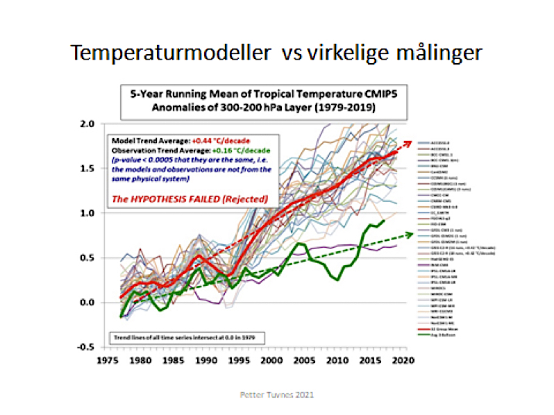 Likevel fremmer IPCC en rekke modeller og spådommer som hittil har feilet. Modellerte temperatur-«projeksjoner» har vist seg å anta 3 ganger så høy temperaturstigning som virkelige målinger i ettertid har vist (prof. dr. John Christy, UAH). Modellene er egnet til å skremme politikere og journalister til å fremme unødvendige og unyttige tiltak som karbonfangst, «grønn» energi o.l.
