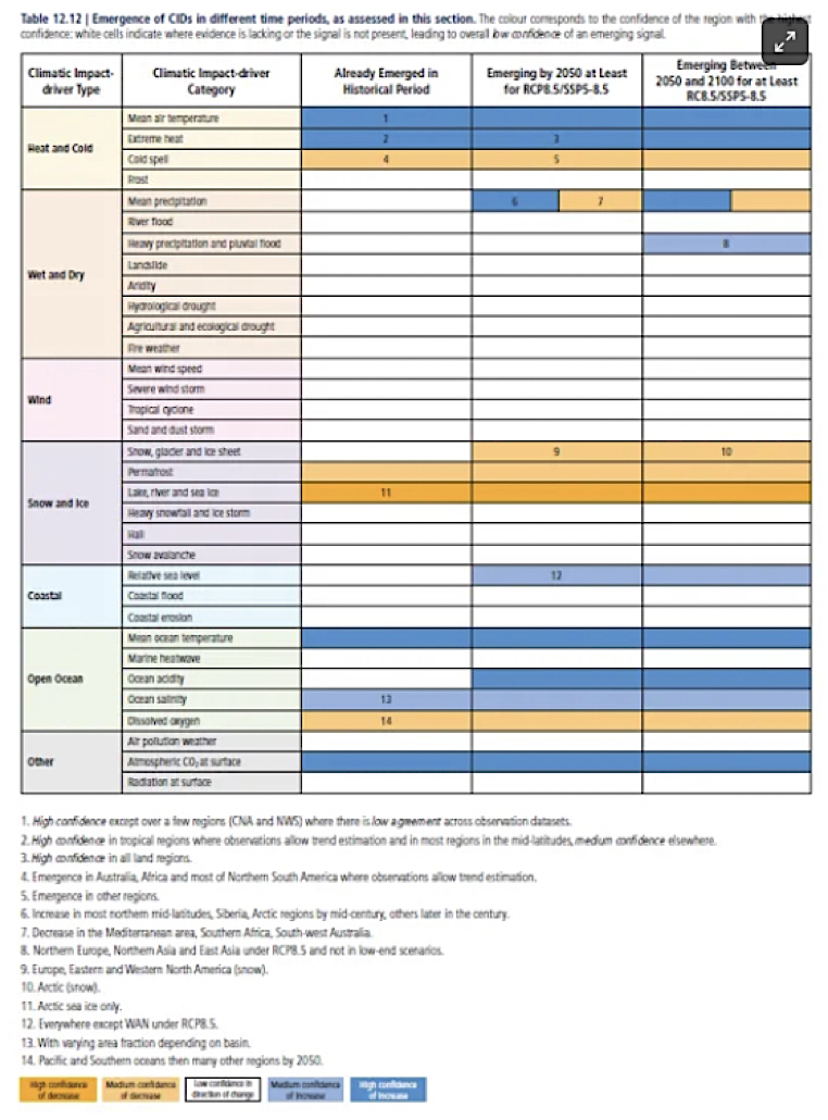 Denne tabellen fra IPCC-rapporten AR6 WG1 kap. 12 oppsummerer viktige klimafenomener.