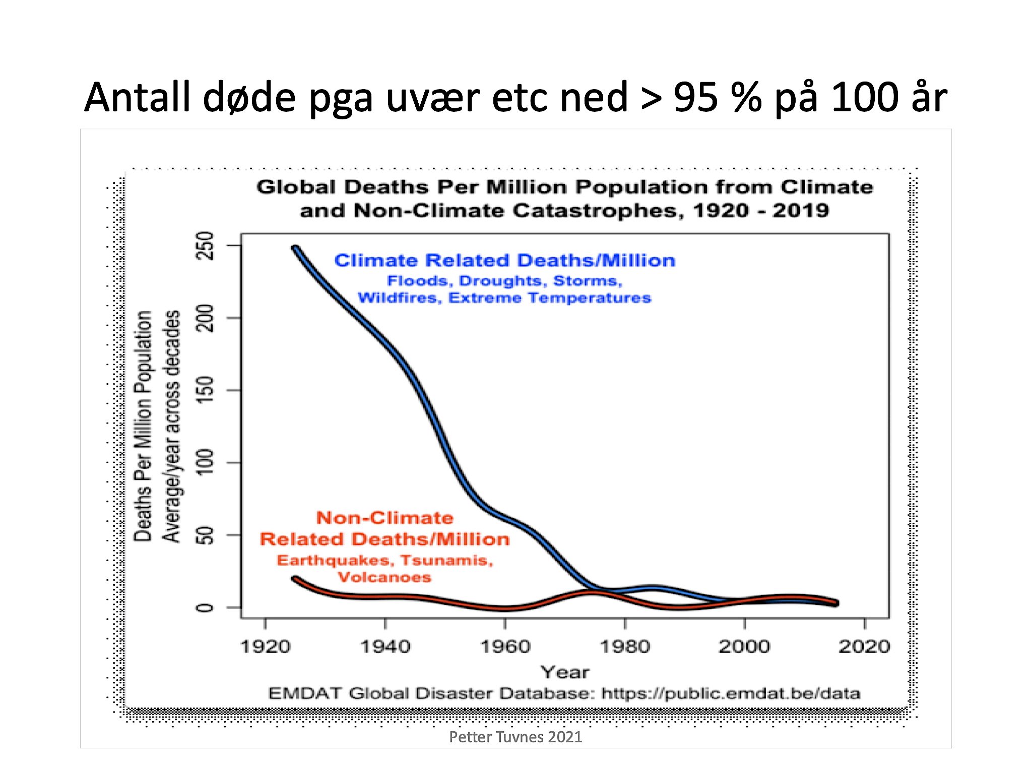 Det klimaet vi har nå, er å sammenligne med den gunstige varmen i middelalderen. I de siste 60 år er det stadig satt rekord i matproduksjon takket være økt temperatur, øking i plantenæringen CO2 med over 30 %, mer bruk av kunstgjødsel og pesticider samt jordbruksrevolusjonen til professor Norman Borlaug.