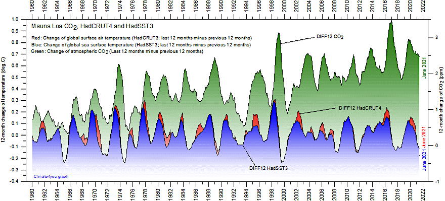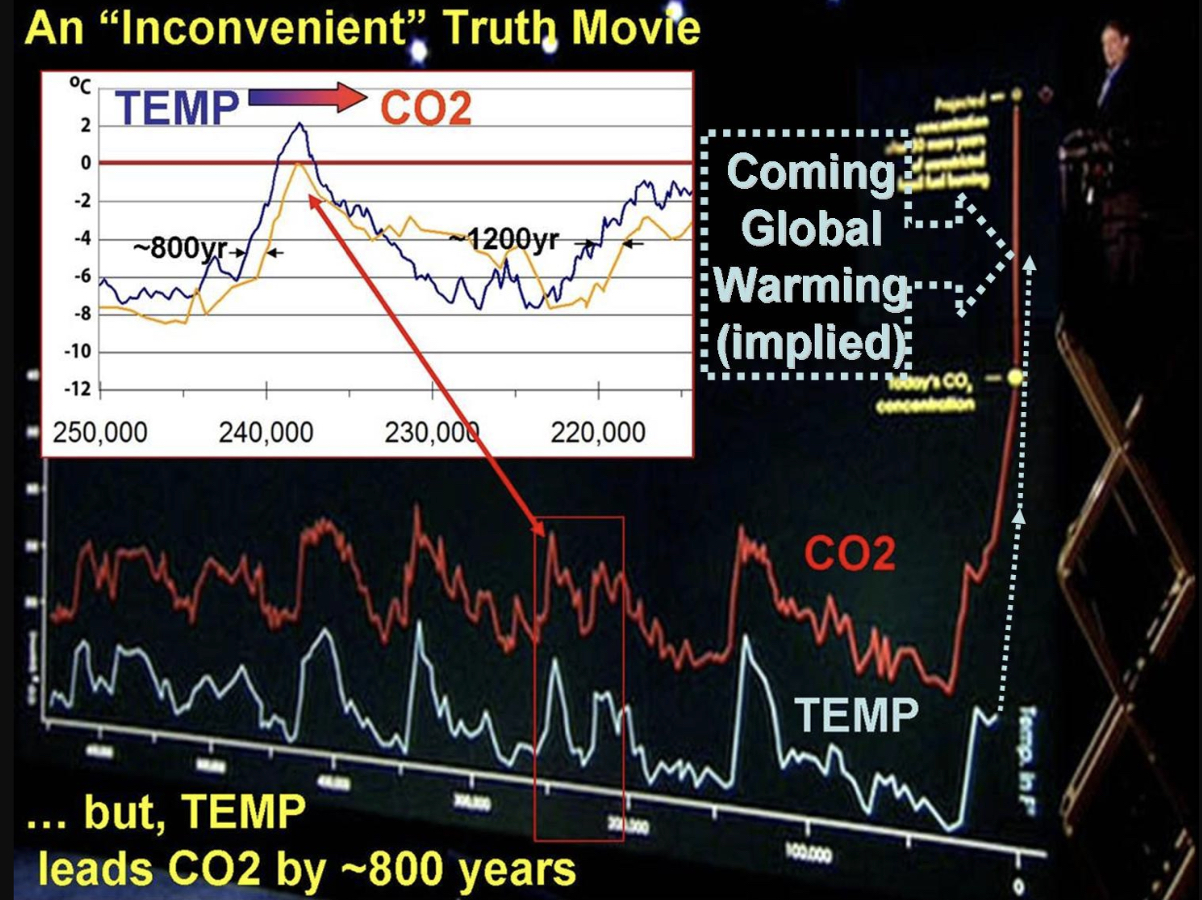 Årsak må nødvendigvis komme før virkning. Målinger av CO2 og temperatur over tid (tidsserier) viser at først endrer temperaturen seg og deretter CO2 i luften. Det viser iskjerneprøver fra både Antarktis (Vostok) og Grønland (GISP) med 800 000 år gamle iskjerner og målinger fra nyere tid (prof. Humlum et al. 2013).