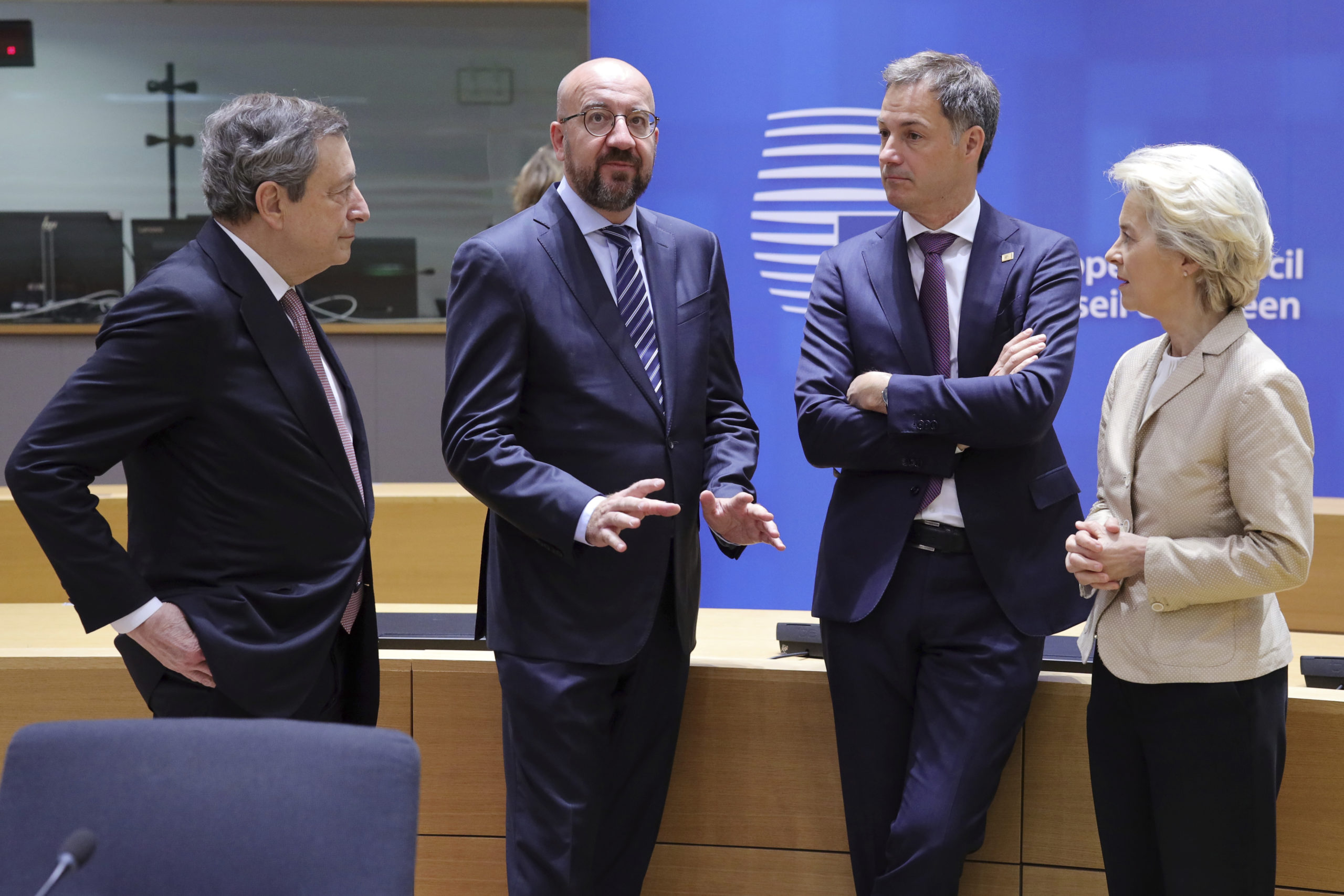 Brussel 31. mai 2022, f.v. Italias daværende statsminister Mario Draghi, EU-rådets president Charles Michel, Belgias statsminister Alexander de Croo og EU-kommisjonens president Ursula von der Leyen. Foto: Olivier Matthys / AP / NTB.