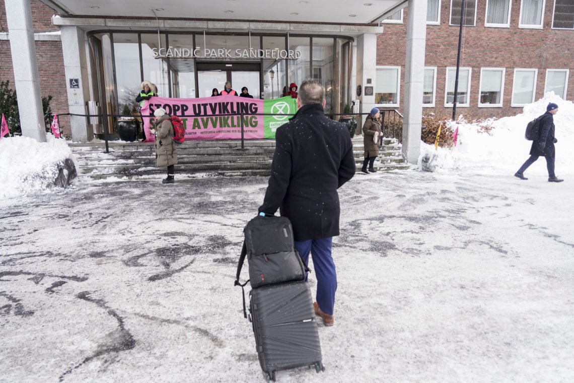 Aktivister fra Extinction Rebellion har blokkert alle inngangene inn til oljeseminaret i Sandefjord der energiminister Terje Aasland skal tale.