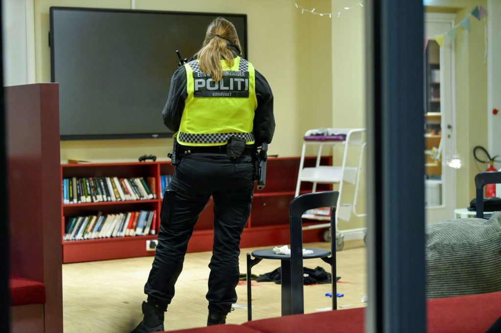 Politi på Holmlia bibliotek etter knivstikkingen tirsdag. Foto: Rodrigo Freitas / NTB