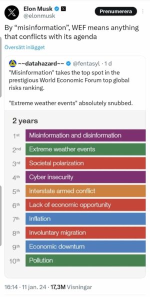 Rapporten mener også at både utenlandske og innenlandske aktører kan bruke feilinformasjon og desinformasjon som et middel for å undergrave legitimiteten til nyvalgte regjeringer. Konsekvensen av en slik utvikling kan være at regjeringer innfører økt sensur, at internett blir mindre fritt og at menneskerettighetene svekkes, mener ekspertene som er intervjuet.Elon Musk kritiserer imidlertid WEFs syn, og skriver på X: «Med ‘desinformasjon’ mener WEF alt som går imot dens agenda».