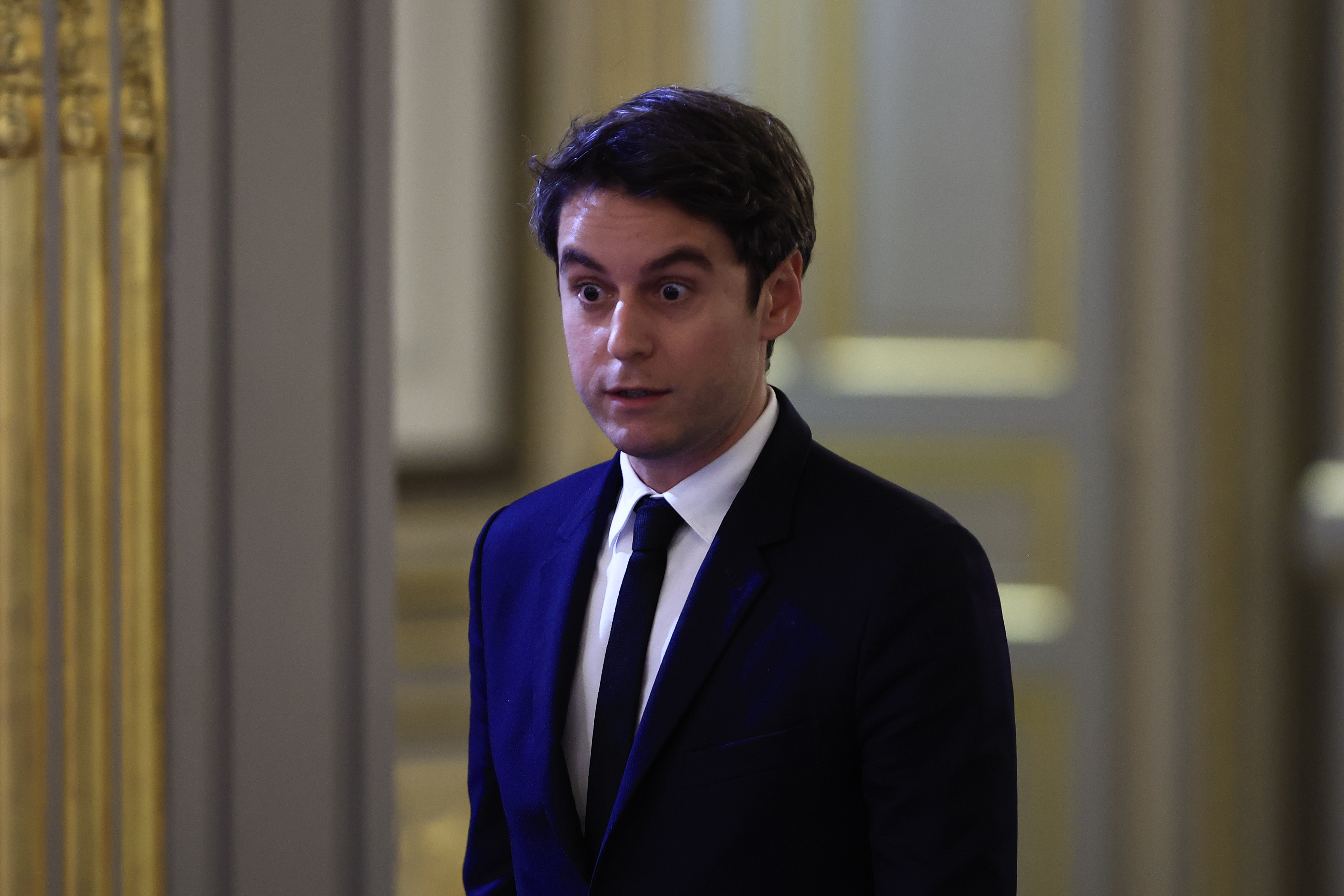 Frankrikes statsminister Gabriel Attal ankommer president Emmanuel Macrons pressekonferanse i Elysée-palasset i Paris den 16. januar 2024. Foto: Aurelien Morissard / AP / NTB.