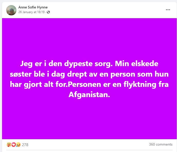 Aina Hynnes søster oppgav i sosiale medier allerede på drapsdagen at han er afghaner.