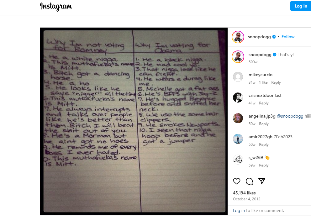 Snoop Dogg har ikke vært redd for å uttale seg om politikk, og i 2012 vakte han oppmerksomhet med en liste på Instagram hvor han sammenligner Barack Obama og Mitt Romney og forklarer hvorfor han ville gi sin stemme til Obama.