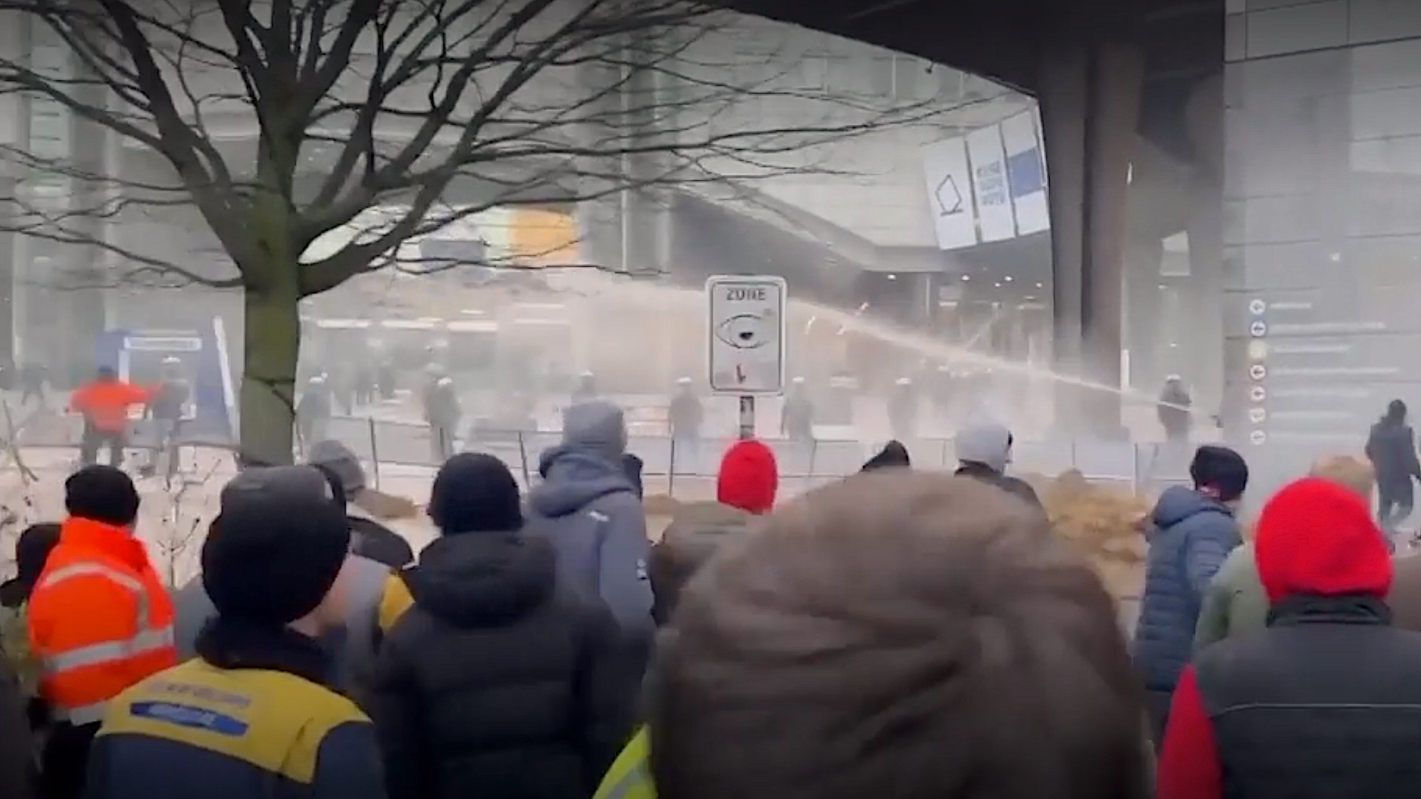 Protesterende bønder har torsdag morgen brukt fyrverkeri og kastet egg mot EU-parlamentet i Brussel, der bygningen er omgitt av piggtråd og opprørspoliti besvarer protesten med å spyle vann på bøndene.