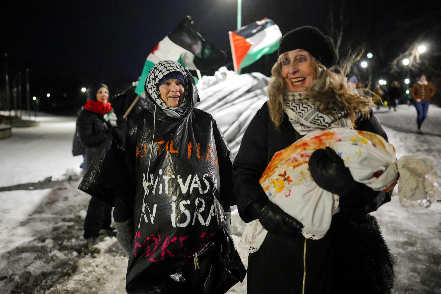 Trondheim 03.02.2024. Markering mot Israel i forkant av MGP-finalen i Trondheim spektrum, lørdag kveld. Foto: Ole Martin Wold / NTB