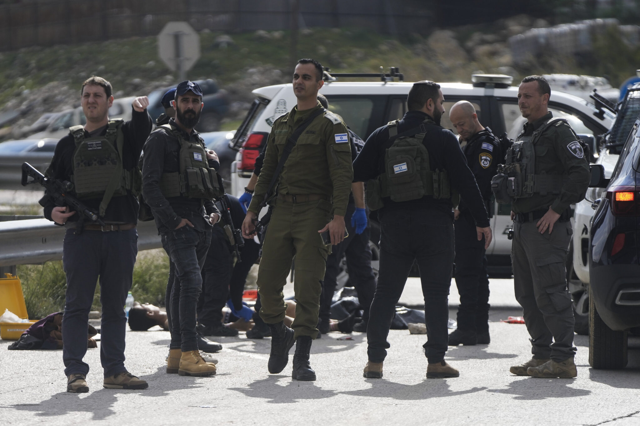 Israelske sikkerhetsstyrker undersøker liket av en palestinsk angriper utenfor den israelske bosettingen Maale Adumim på Vestbredden den 5. februar 2024. Foto: Mahmoud Illean / AP / NTB.