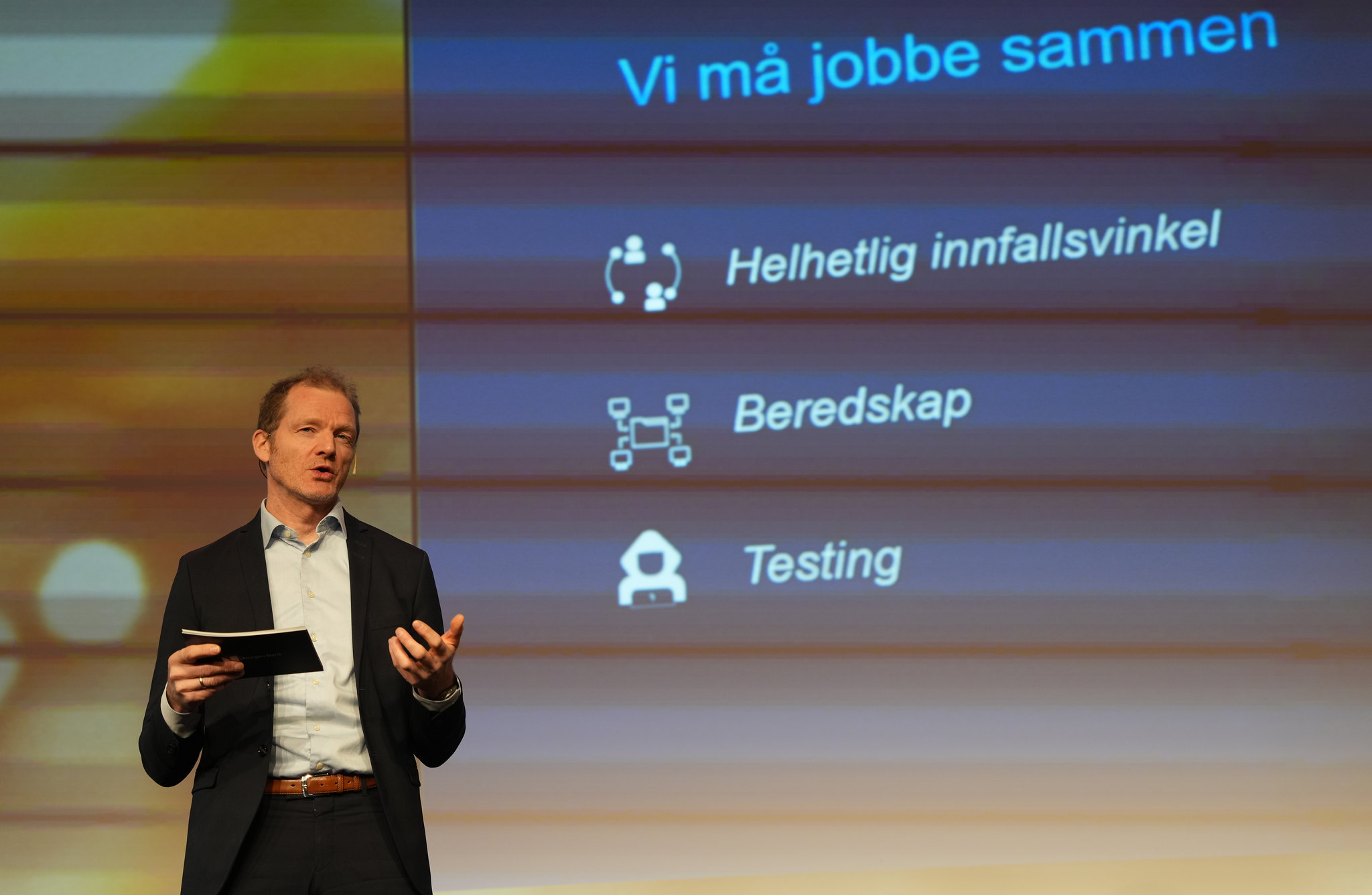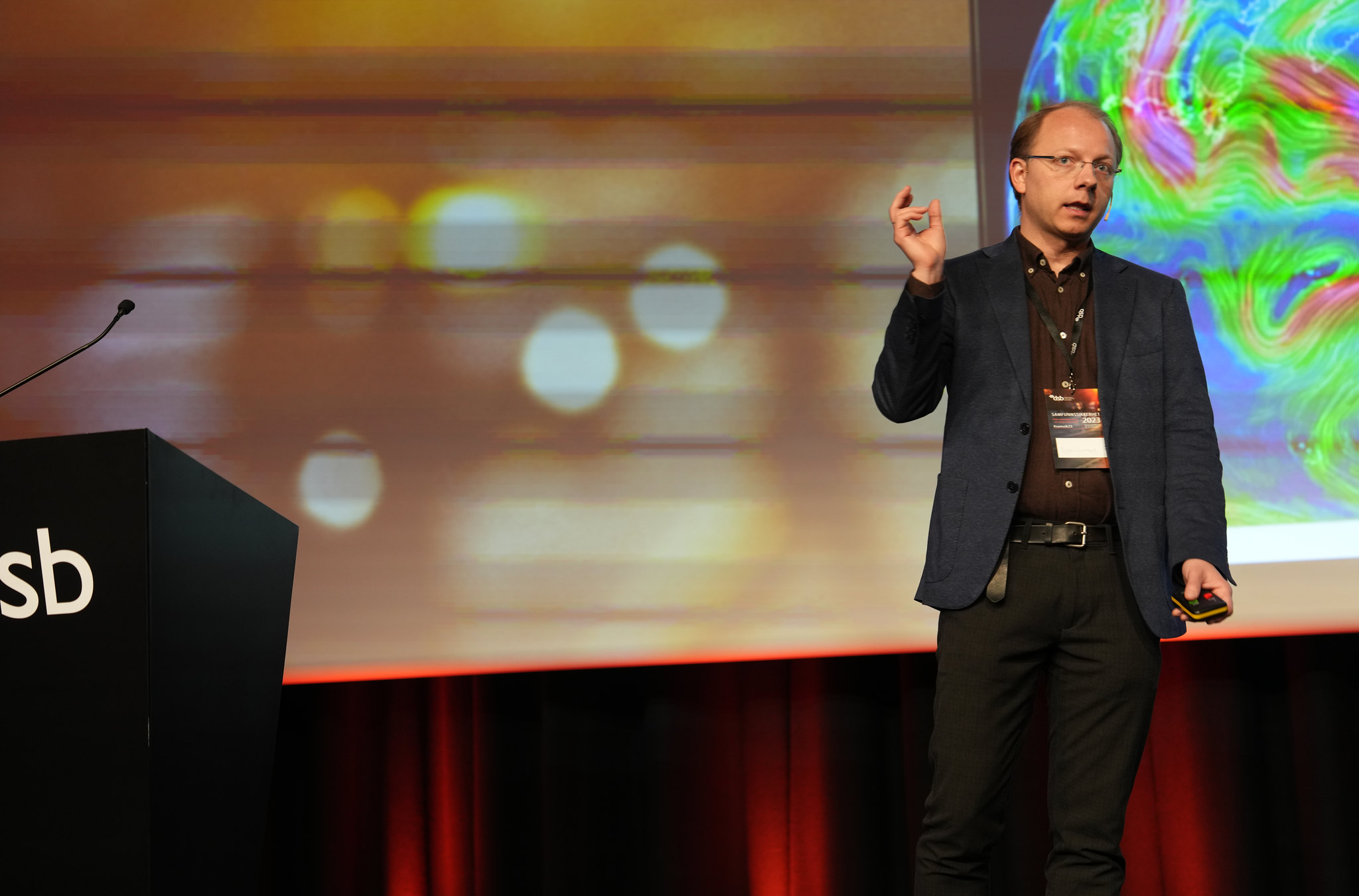 Bjørn Samset, fysiker og klimaforsker ved Cicero, taler under DSB-konferansen «Samfunnssikkerhet 2023», hvilket tyder på at DSB anser klimaendringer og ikke klimapolitikk som en sikkerhetstrussel. Foto: Anita Andersen / DSB / Flickr (cc by-nd 2.0 deed)