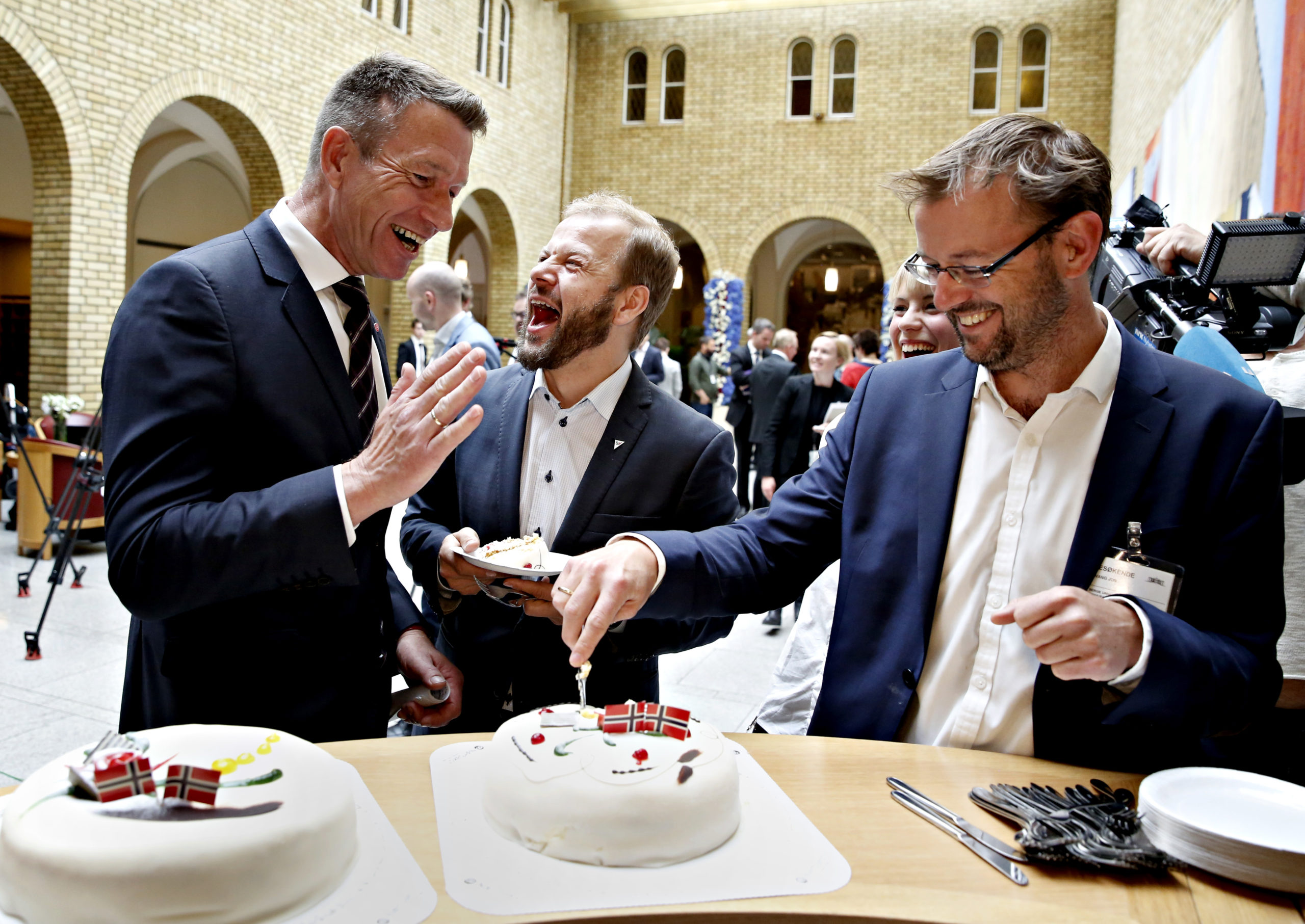 Året er 2014 og Terje Aasland (Ap), Heikki Holmås (SV) og Jon Evang fra «miljøstiftelsen» Zero feirer vedtaket om elektrifisering av Utsirahøyden i Nordsjøen, der Johan Sverdrup-feltet ligger. Året etter var Holmås saksordfører da Stortinget ratifiserte Paris-avtalen. Foto: Marte Christensen / NTB
