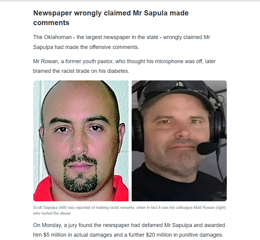 Sapulpa saksøkte avisen i ettertid for ærekrenkelse og hevdet at han led varig skade og emosjonell ubehag som følge av hendelsen – selv om navnet hans bare var knyttet til artikkelen i mindre enn tre timer.