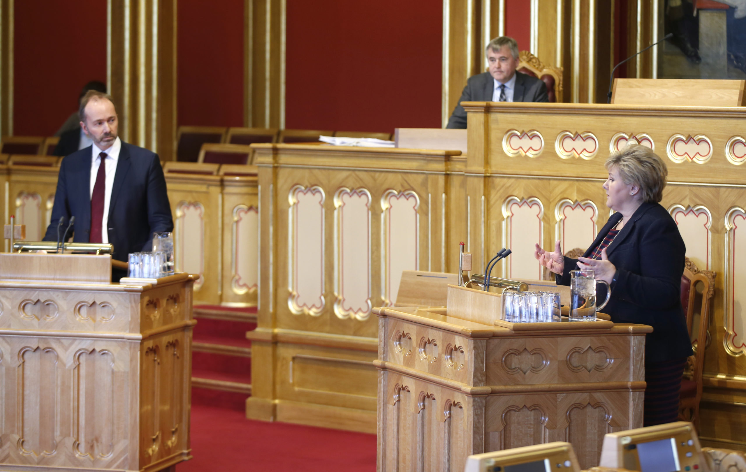 Trond Giske (Ap) og Erna Solberg (H) under Stortingets spørretime 13. januar 2016. Foto: Vidar Ruud / NTB.