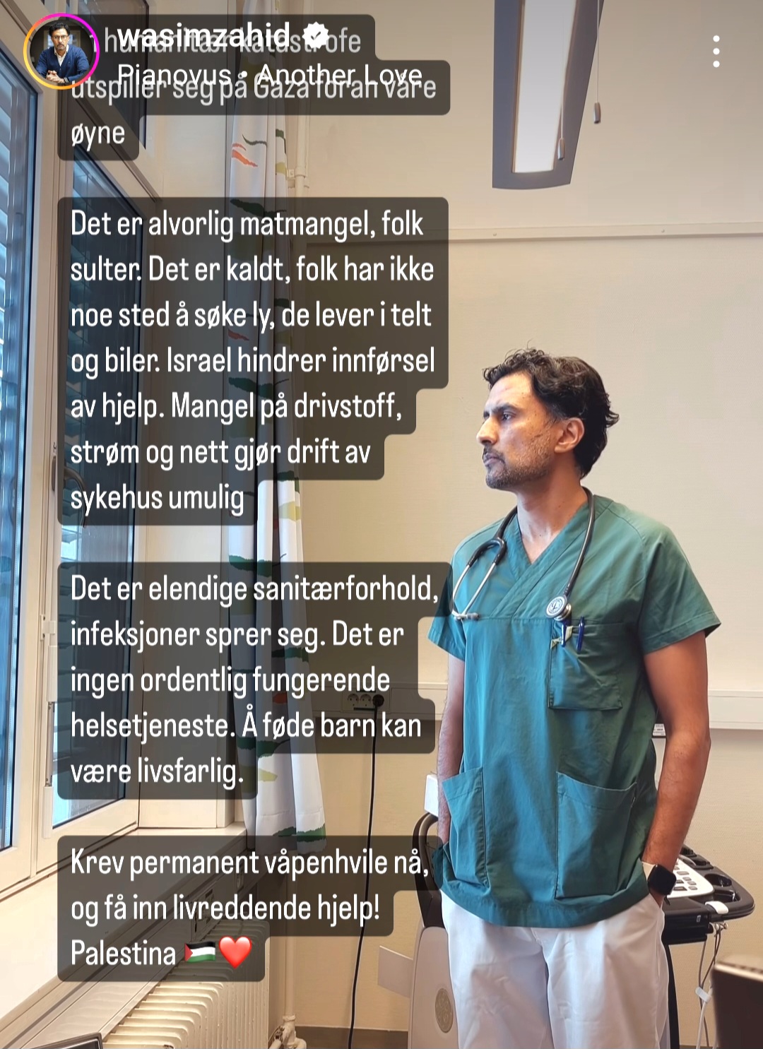 Wasim Zahid er lege ved Drammen sykehus, og begynte sin anti-israelske kampanje allerede 14. oktober, det vil si kun en uke etter det største terrorangrepet mot jøder siden Holocaust. Han ser ikke ut til å ha kommentert den barbariske massakren av 1200 i Israel i det hele tatt, i medier som Facebook og Instagram. Heller ikke nedslaktingen av unge på festival, eller at flere hundre ble tatt som gisler til Gaza.