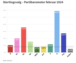 Det er et soleklart borgerlig flertall på Opinions februarmåling, utført for FriFagbevegelse og Dagsavisen. Måling gir de borgerlige partiene Høyre, FrP og Venstre 92 mandater, og dermed rent flertall uten å måtte knytte seg til KrF.