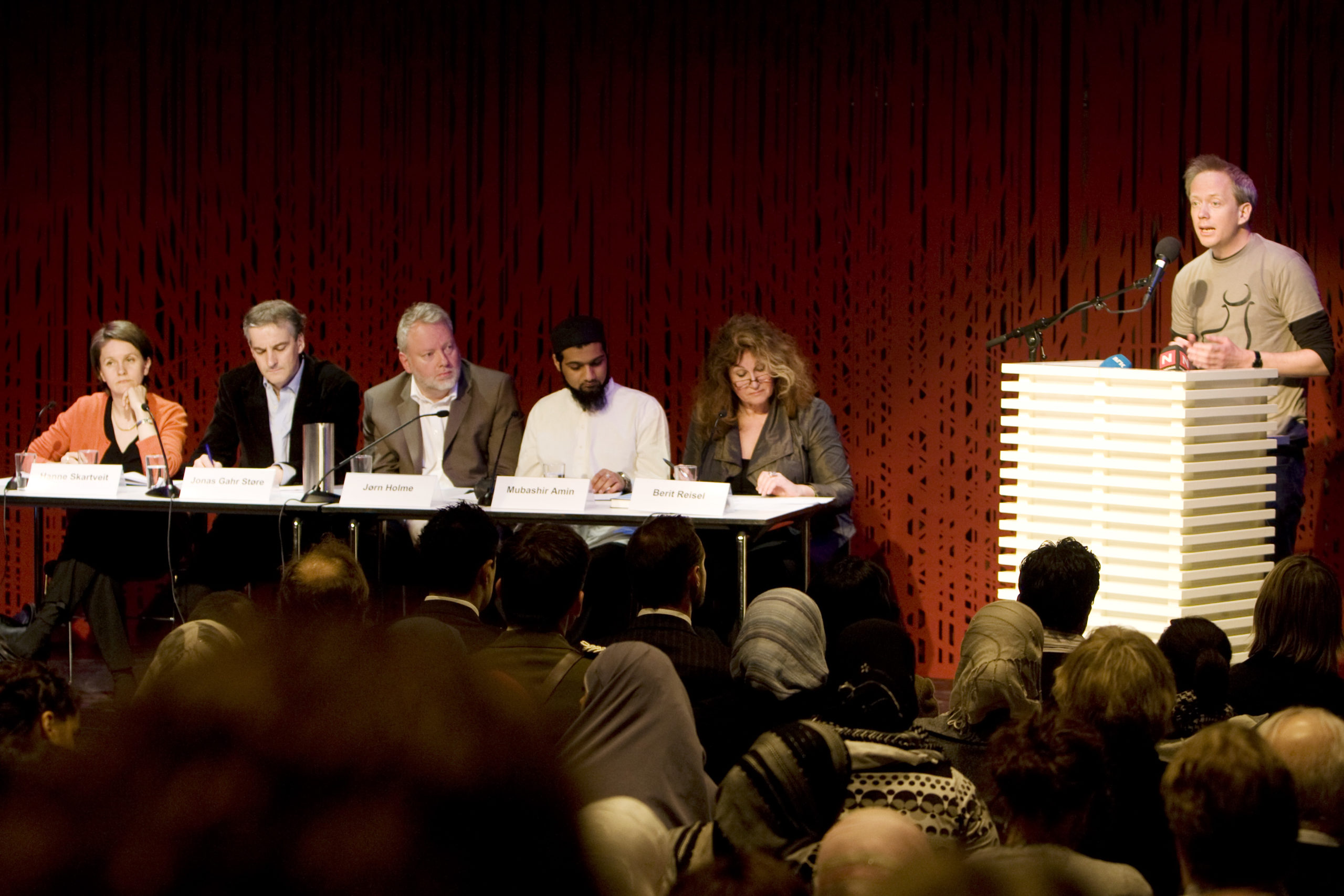 Dag Øistein Endsjø innledet om temaet «Hat mot homofile i religionens navn» under Dialogmøte om hat på Litteraturhuset i Oslo søndag. I diskusjonspanelet satt f.v.: VG-redaktør Hanne Skartveit, utenriksminister Jonas Gahr Støre, PST-sjef Jørn Holme, styremedlem i Salam-bladet Mubashir Amin og styremedlem ved Holocostsenteret Berit Reisel.