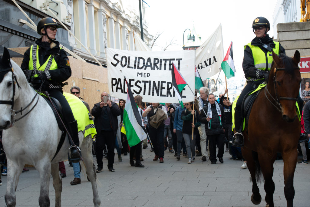 OSLO – APRIL 14: Protesters carry a sign reading «Solidarity with Palestinians» in a march to Norway’s parliament building to protest Israel’s shooting of Palestinians in Gaza. Oslo, April 14, 2018. Photo: Shutterstock by Ryan Rodrick Beiler, Norway.