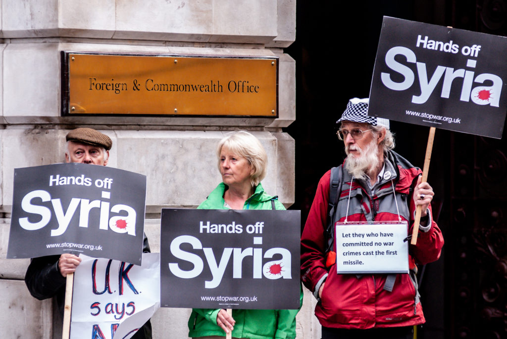 London, UK – 9 September 2013: Protesters hold placards reading «Hands off Syria» during an antiwar demo against military action in Syria. Photo: Shutterstock by pcruciatti, Italy.