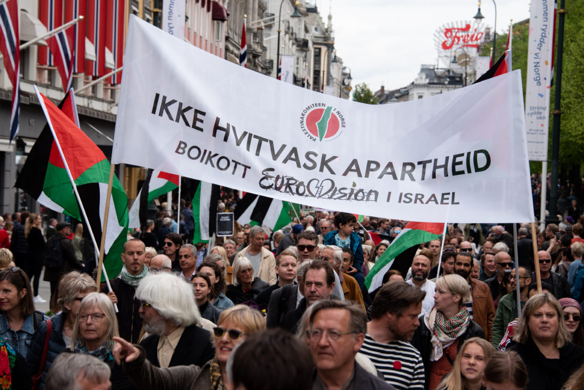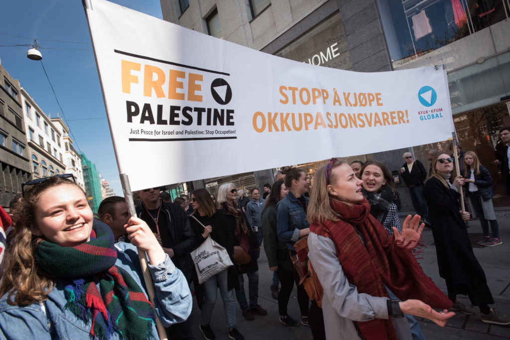 OSLO – MAY 1: Activists carry a banner in English and Norwegian: «Free Palestine: Stop Buying Occupation Products» at the annual May Day march in Oslo, Norway, May 1, 2017. Photo: Shutterstock by Ryan Rodrick Beiler, Norway.