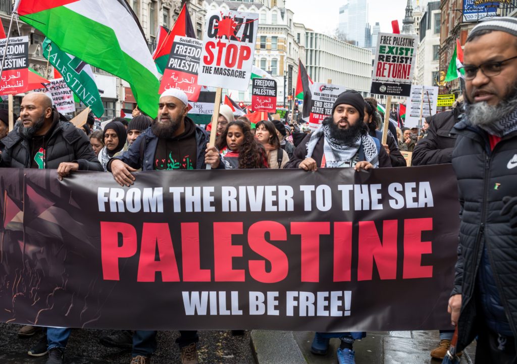 London, UK. 9 Dec London UK – Dec 9 2023: Pro-Palestinian muslim protesters hold a banner saying «From the river to the sea…» and chant at a protest calling for an end to Israeli attacks on Gaza. Photo: Shutterstock by Andy Solomon, UK.