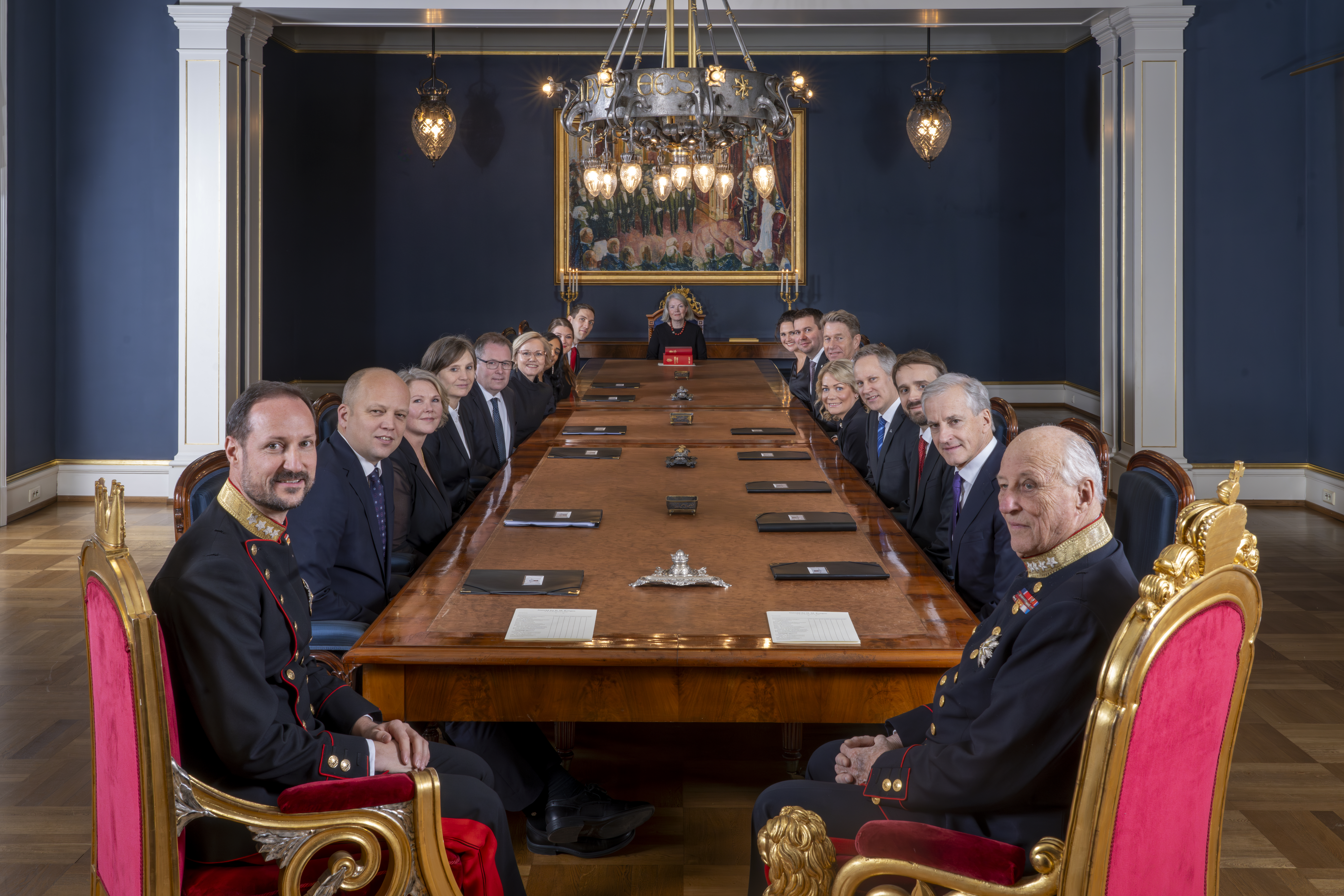 Jonas Gahr Støres regjering møtes til statsråd med kong Harald og kronprins Haakon på Slottet i Oslo den 15. desember 2023. Foto: Heiko Junge / NTB.