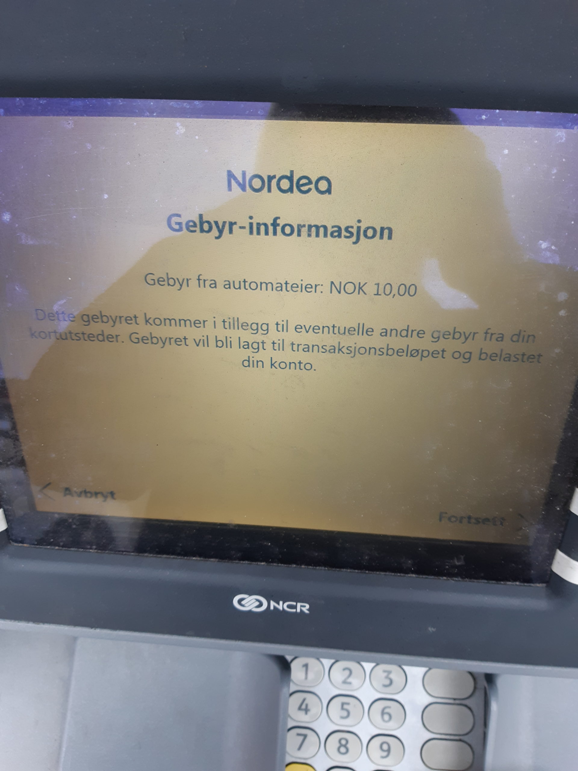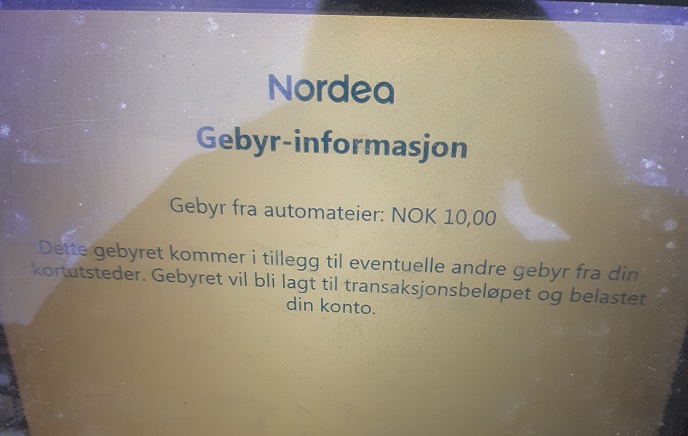 Jeg puttet inn sparebanken kort inn i Nordea minibank – advarsel 10 kr gebyr for uttak.
