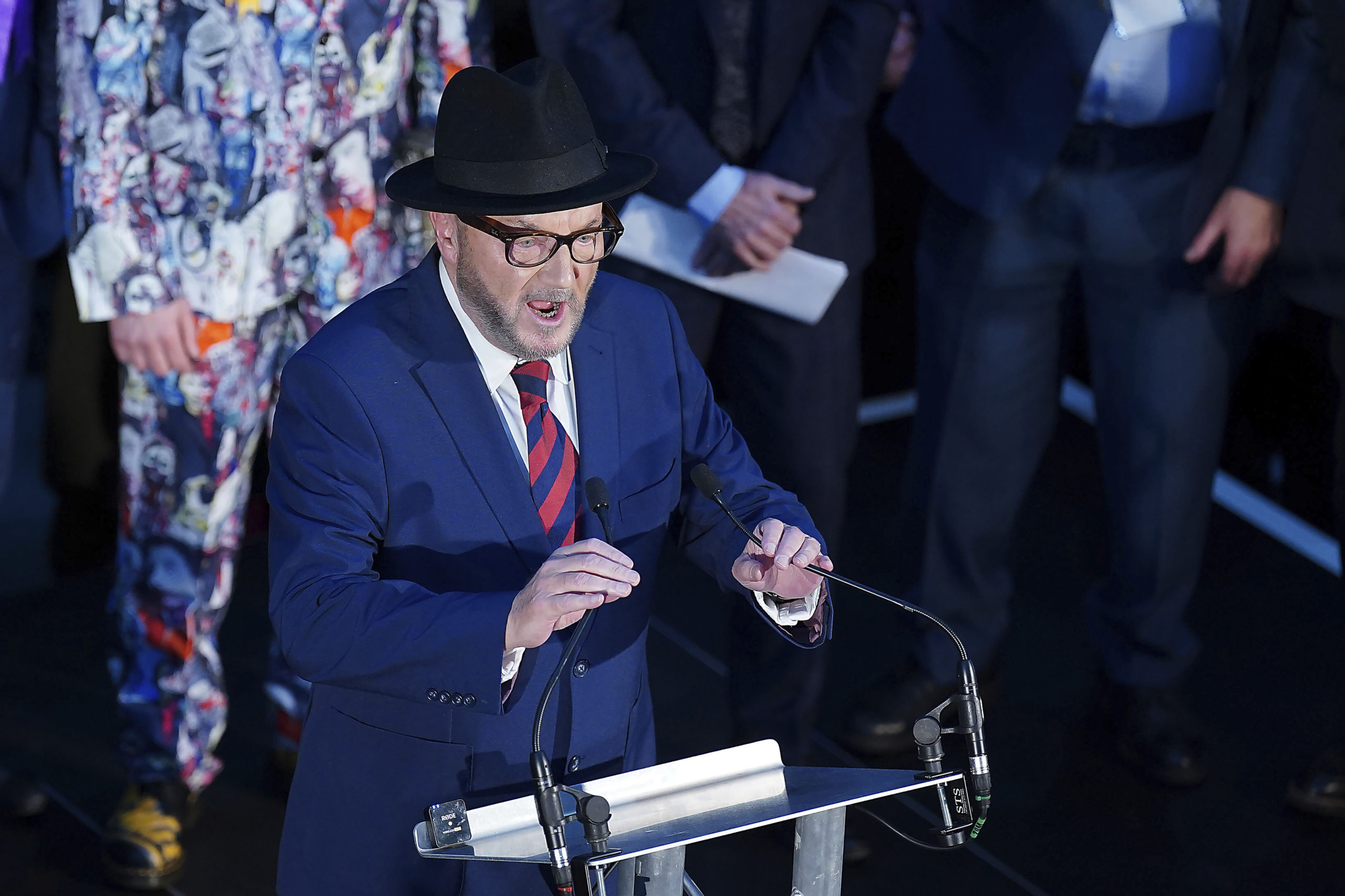 George Galloway taler etter å ha vunnet suppleringsvalget i Rochdale i Storbritannia den 29. februar 2024. Foto: Peter Byrne / PA via AP / NTB.