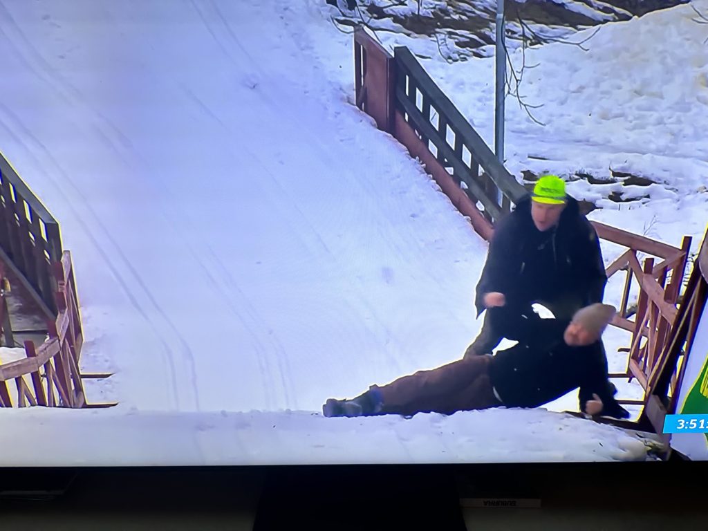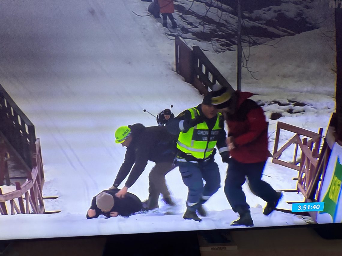 Men takk og lov var ikke de svenske vaktene langs tribunene født i går. Imponerende raskt kastet de seg over inntrengerne, og fikk dem delvis slengt ned i snøen, og delvis skysset ut fra løypa.