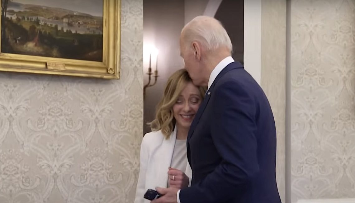Joe Bidens tilbøyelighet til å sniffe småjenter i håret er velkjent, men med Giorgia Melonis nylige besøk i Det hvite hus praktiserte han også øvelsen med en statsleder. Takket være velvillige omgivelser, ikke minst pressekorpset og en Meloni som gjorde gode miner til slett spill, slipper creepy Joe unna med alt. Stillbilde: Vista Agenzia Televisiva Nazionale / YouTube.