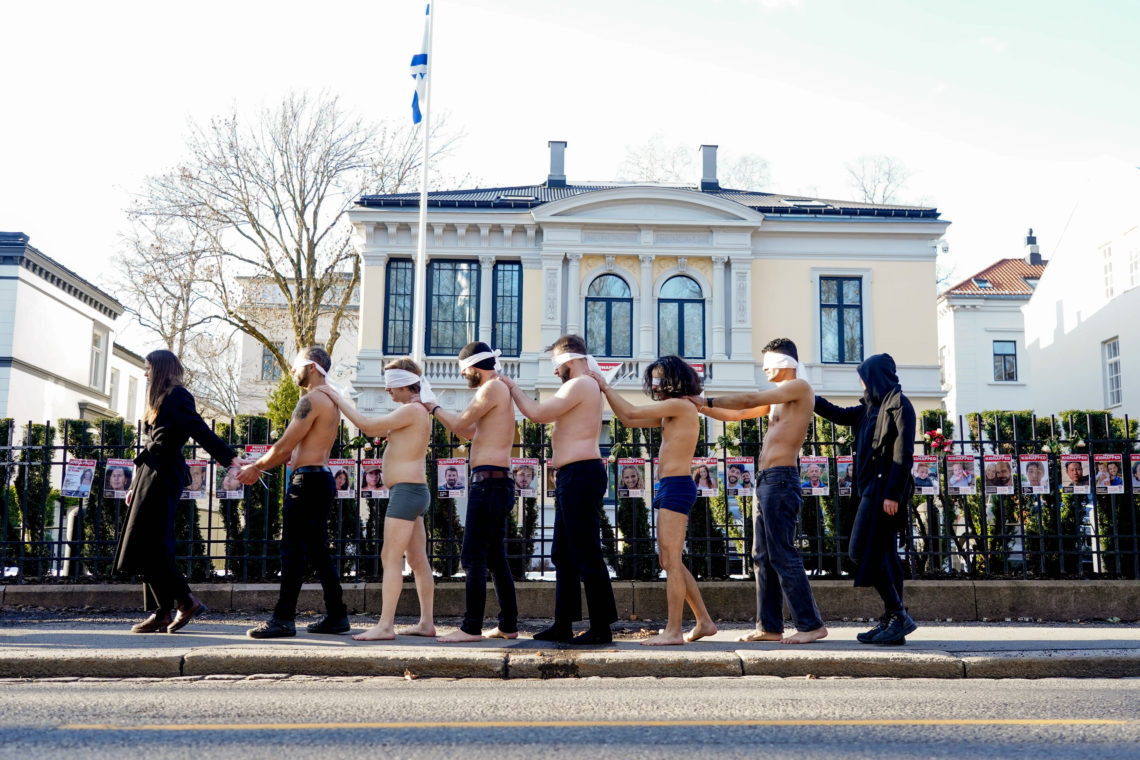 Tirsdag demonstrerte Aksjonsgruppa for Palestina foran Israels ambassade ved å kle av seg og spille fanger.