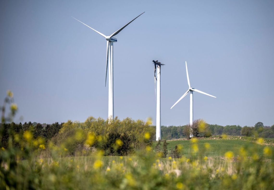 Et vindkraftverk i Ystad i Sverige, der en av turbinene er herjet av brann. Foto: Johan Nilsson / TT / Kod 50090