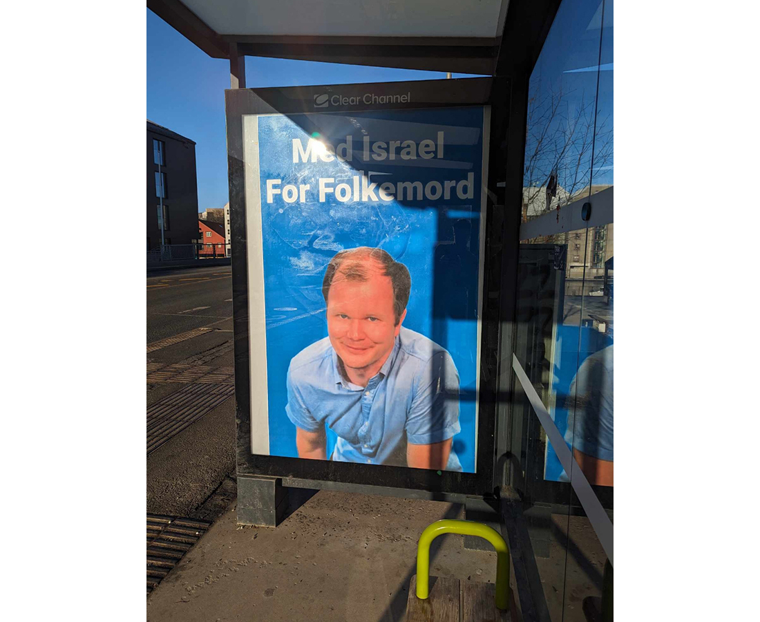Men mandag i Trondheim tok agitasjonen et nytt steg: Da hengte noen opp et bilde av MIFFs leder Conrad Myrland i et busskur.